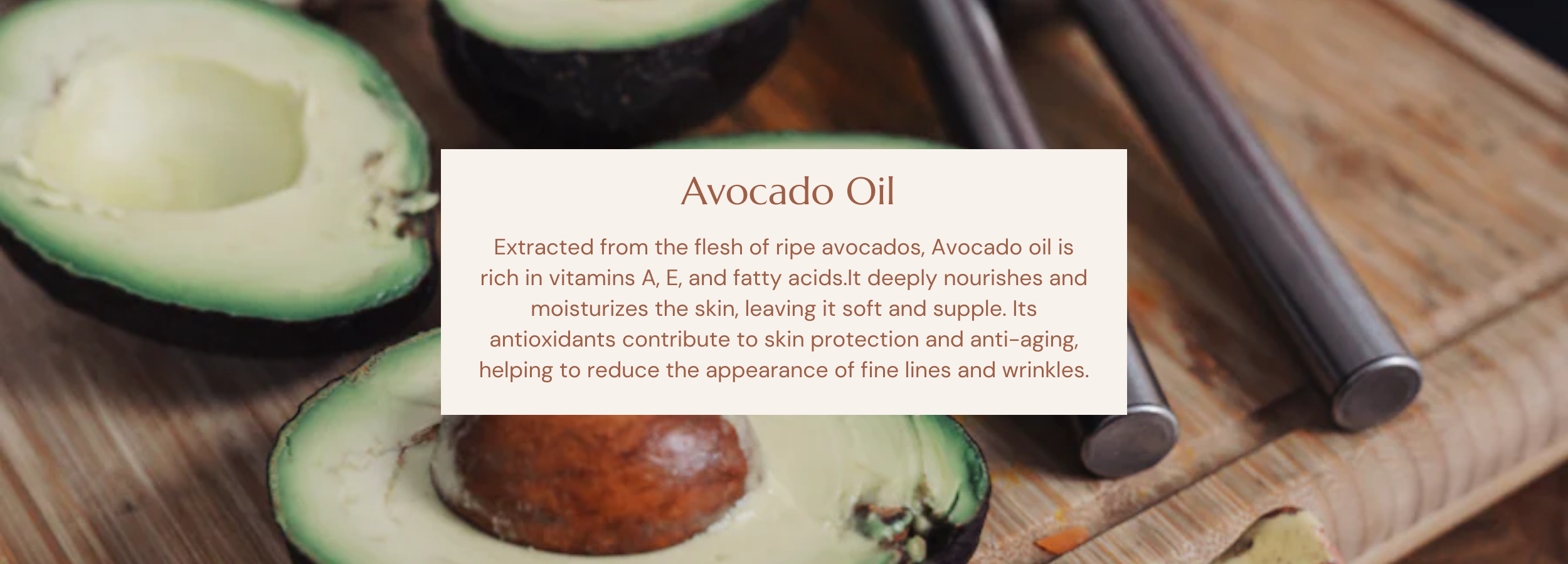 Avocado Oil: A nutrient-rich oil derived from avocados, known for its deep hydration and beneficial effects on the skin