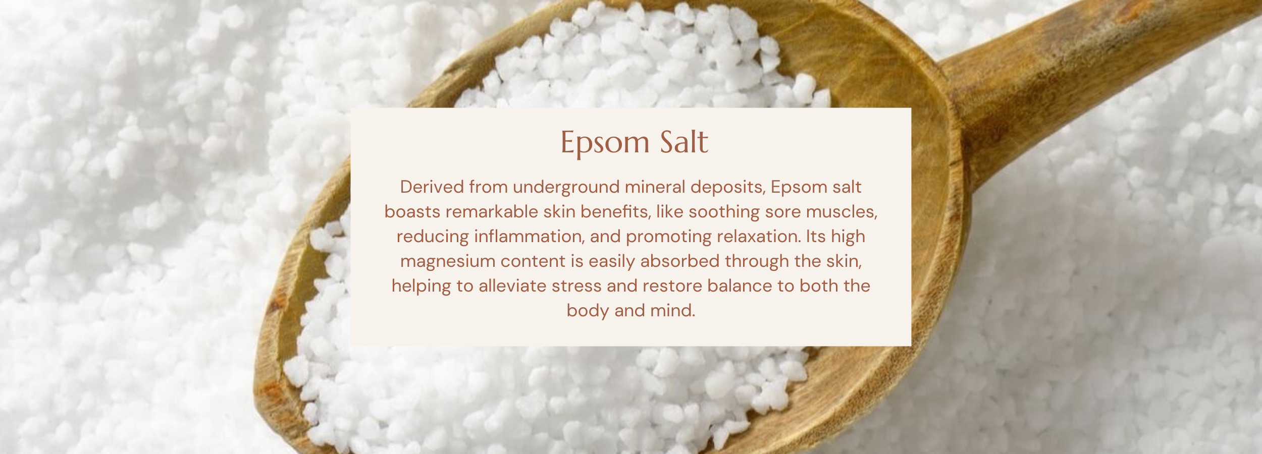 Epsom Salt: A mineral compound containing magnesium and sulfate, used to promote relaxation, soothe sore muscles
